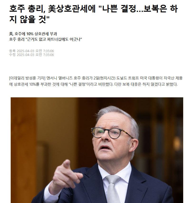 트럼프의 상호관세 발표 직후 호주에서 가장 먼저 공식 반응이 나왔으며, 유럽연합은 다음 날 관련 대응책을 발표할 예정이다.